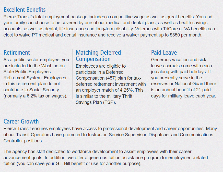 Pierce Transit is proud to be an agency who hires veterans and are proud to have been recognized by Yes Vets for our efforts! Approximately 20% of our workforce is comprised of veterans.