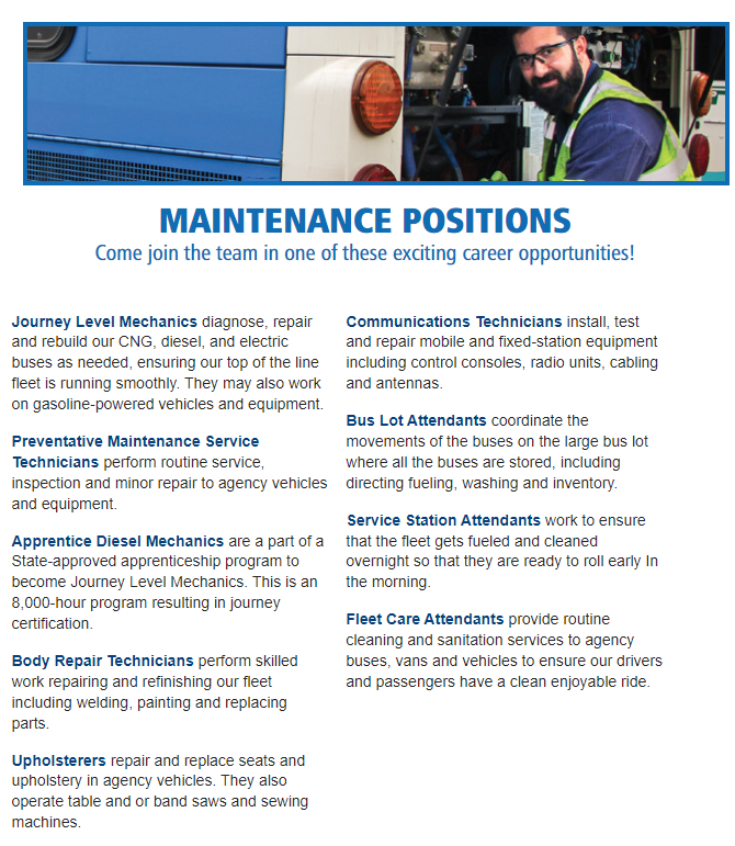 Are you interested in working for Pierce Transit, but are not sure if being an Operator or sitting behind a desk is right for you? If you enjoy working with your hands and want to give back to your community, you may be interested in our Maintenance Division! Click on the button to learn more about our Maintenance group from the employees themselves.